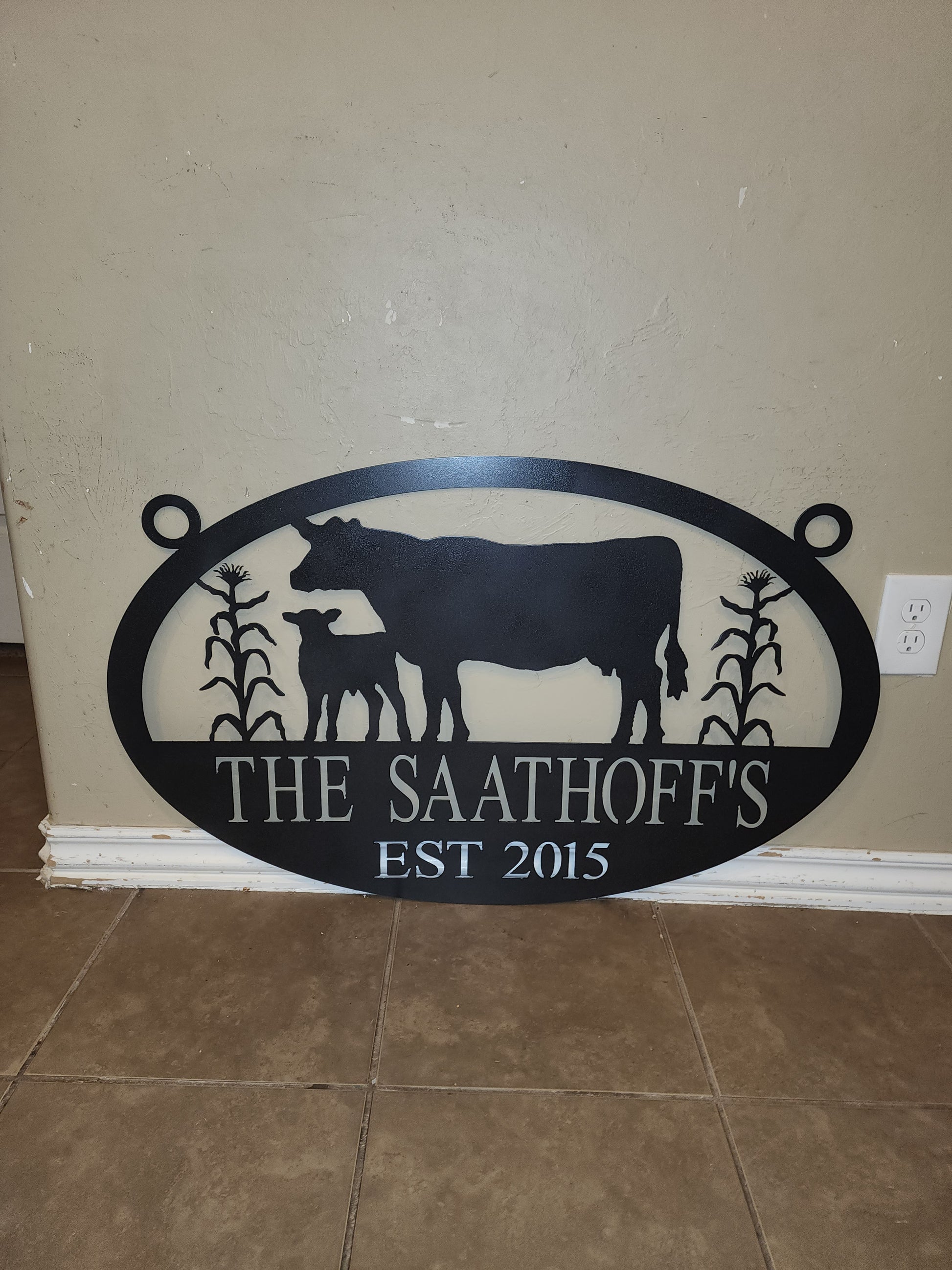 Custom made metal sign with the personalized wording you want on it.